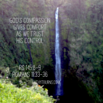 It is a comfort to know that this chaotic world is held by a sovereign God Who is the giver of all good gifts (James 1:17) , and has compassion on all His works (Psalms 145:9) with a wisdom that is beyond our capabilities to comprehend (Romans 11:33-36). The presence of this love brings a peace as we trust His control. Have you ever come on anything quite like this extravagant generosity of God, this deep, deep wisdom? It’s way over our heads. We’ll never figure it out. Is there anyone ... Read More about My Morning Reflections